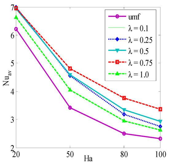 Figure 11, Figure 12, Figure 13, Figure 14 and Figure 15 illustrate the mean Nusselt number (Nuav) on the warmed sidewall for various parameters. Figure 11 and Figure 15 show the mean Nusselt number (Nuav) drops with the growth of the Hartmann number, whereas it upturns for the rise of Ra. The Lorentz forces increased by the addition of nano-sized particles into the base fluid, which produced a stronger resistance to the movement of the liquid. Consequently, the thermal efficiency of the nanofluid reduces compared to the base fluid. A higher average rate of temperature transport is observed for the non-uniform magnetic effect when λ = 0.75 than the uniform magnetic effect. Figure 12 shows that the accumulation of nano-sized particles augments the average temperature transfer rate. Figure 13 shows that the size of the nanoparticles is a important for making a stable nanofluid. The nanoparticles are highly affected by the rate of heat transfer of a nanofluid. Above all, the outcomes are calculated for the spherical shape of the nanoparticles. Figure 14 shows that the mean Nusselt number is significantly greater for nano-sized particles with a blade shape compared to a spherical shape. This is because the total surface area of the blade-shaped particles is higher compared to other shapes of nano-sized particles. Table 3 represents the mean Nusselt number for various water-based nanofluids. It shows a higher average rate of heat transport for nanofluids than the base fluid, even with a 1% volume fraction of nanoparticles. It also illustrates that the mean Nusselt number (Nuav) is higher for Fe3O4-water nanofluids than the six other varieties of nanofluids, although the CNT nano-sized particles exhibits higher thermal conductivity.