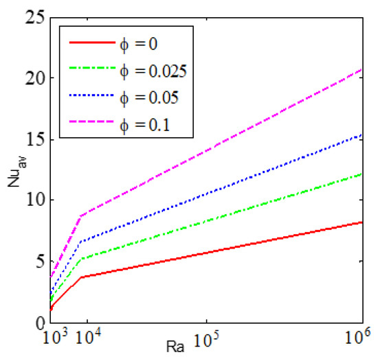 Average Nusselt number (Nuav) for different Rayleigh number (Ra) and nanoparticles volume fraction (ϕ) when λ = 0.5, Ha = 30, d = 10 nm, n = 3, and τ = 1.
