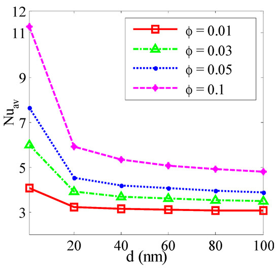 Average Nusselt number (Nuav) for different nanoparticles diameter (d) and nanoparticles volume fraction (ϕ) when Ra = 106, Ha = 30, λ = 0.5, d = 10 nm, n = 3, and τ = 1.