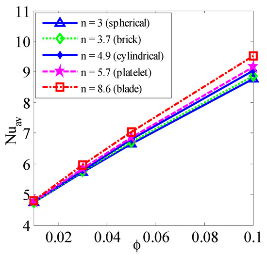 Average Nusselt number (Nuav) for the nanoparticles shape (n) and nanoparticles volume fraction (ϕ) when Ra = 106, Ha = 30, d = 10 nm, n = 3, λ = 0.5, and τ = 1.