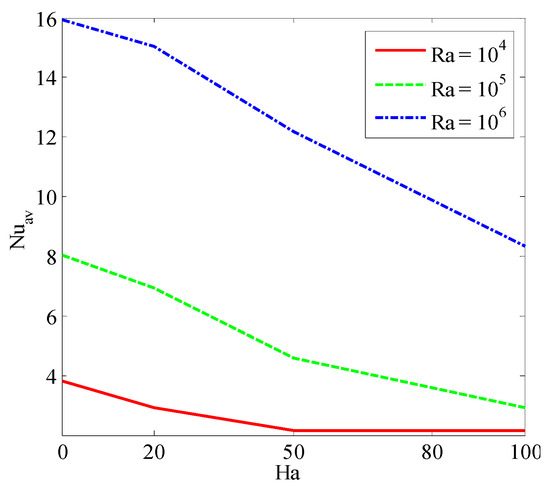 Variation of mean Nusselt number (Nuav) for various Rayleigh numbers (Ra) and Hartmann number (Ha) when ϕ = 0.04, n = 3, d = 10 nm, n = 3, λ = 0.5, and τ = 1.