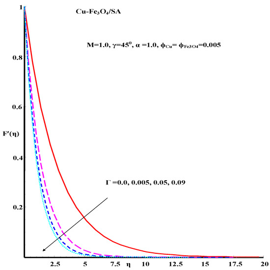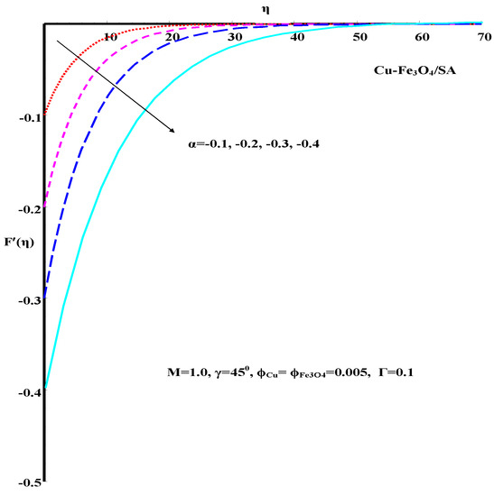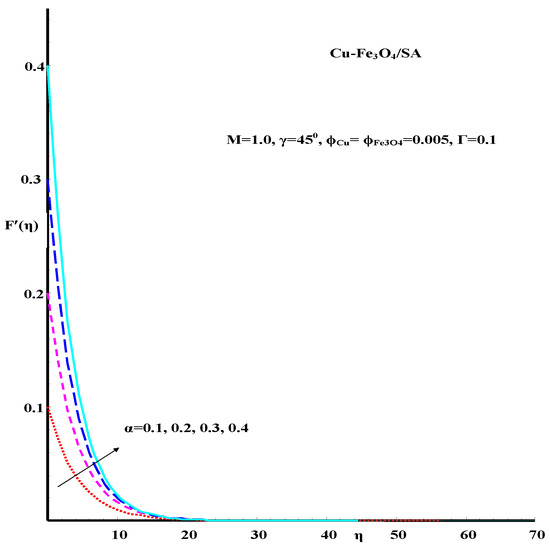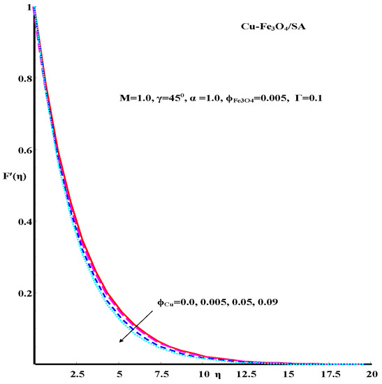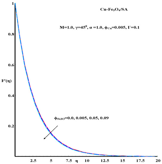 The nanosolid volume fraction parameters and on velocity profiles are illustrated in Figure 3 and Figure 4, respectively. From these figures, enhancing the value of and in both cases, diminishes the velocity profile. This means that the enveloping value of a nanosolid can slow down the SA-based hybrid nanofluid velocity. The enlarged density of the fluid, contributes to the reduction in velocity. Figure 5 shows the behavior of the Casson parameter on the velocity profile. From this figure one can see that SA-based hybrid nanofluid velocities slow down in the presence of enlarging value of the Casson parameter.