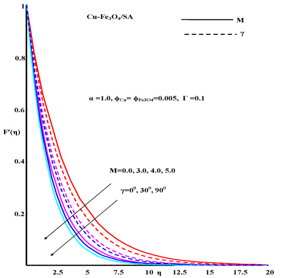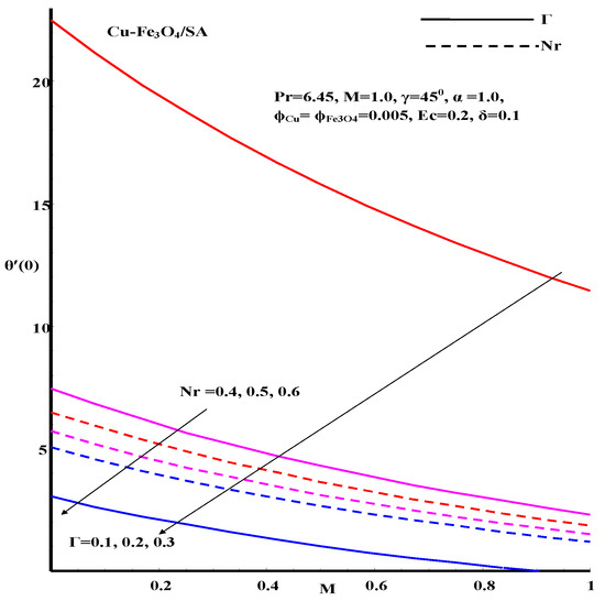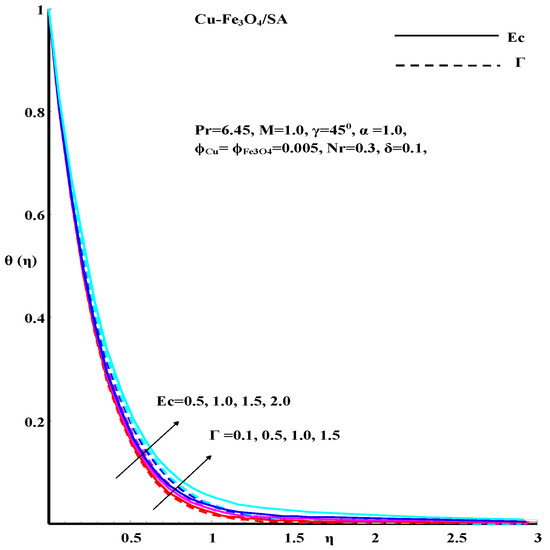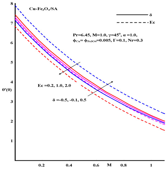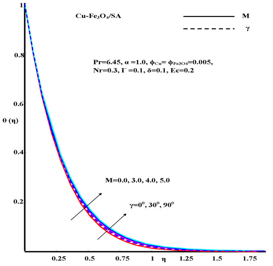 Inclined angle and magnetic parameters impact on and are illustrated in Figure 6 and Figure 7. From these figures, the enlarging the value of inclined angle and magnetic parameters means that the magnetic field strength is improved at the same time that the SA-based hybrid nanofluid’s velocity is reduced. The enlarging value of inclined angle and magnetic parameters with improving the SA-based hybrid nanofluid temperature is shown in Figure 7. Physically, the presence of the inclined angle the and magnetic parameters slow down the fluid, while at the same time suddenly increasing heat transfer.