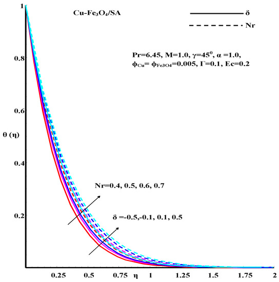 Figure 8 displays to the impact of both the and Casson parameter on the temperature profile. From these figures, it is observed that the thermal effect of the fluid is higher for higher estimations of both the Eckert number and Casson parameter. Furthermore, the thermal surface layer thickness is developed for the higher value of the and . These two parameters enhance the heat conduction in SA-based hybrid nanofluids. Figure 9 illustrates the consequences of heat source/sink and radiation parameters on . These plots show that both the thermal surface thickness and temperature profiles are increased with the heat source and radiation parameters. Actually, enhancing the heat surface layer thickness may minimize the thermal flux on the surface, which minimized the temperature profile.