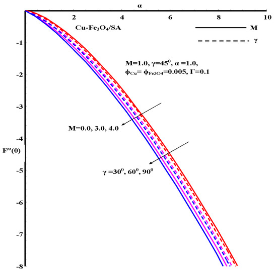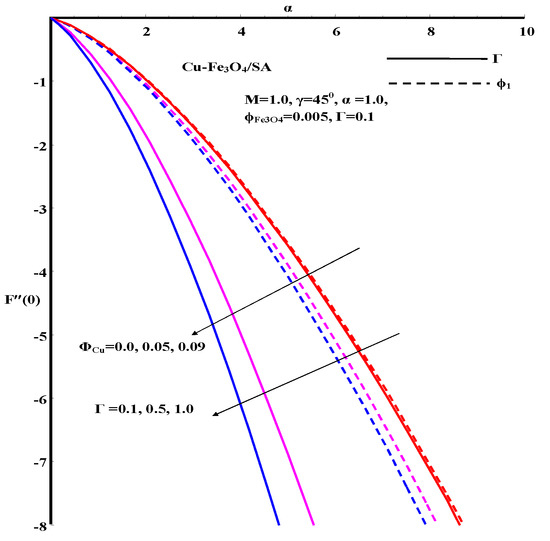 Figure 10 presents the effect of the inclined magnetic field on the . Enhancing the values of the inclined angle and magnetic field lead to reduced skin friction. Physically, the enhancing of magnetic field strength means the skin friction coefficient was minimized. The Casson parameter and nanosolid volume fraction parameters on the are shown in Figure 11. It is evident that is reduced with the enhancing value of both Casson and nanosolid volume fraction parameters.