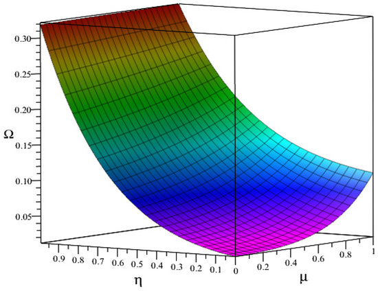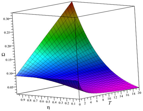 The stability condition (11) thus obtained for HDFGHPE (21) is tabulated for different fractional order in Table 1 and represented in Figure 1. For an increase in time, the stability condition increases gradually for all values of η in , and the Ω is clearly less than 1 satisfying the condition obtained in Theorem (5). An important observation to be made is when order is small the value of Ω decreases with increasing time. As the order increases, this trend changes with value of Ω increasing for increase in time.