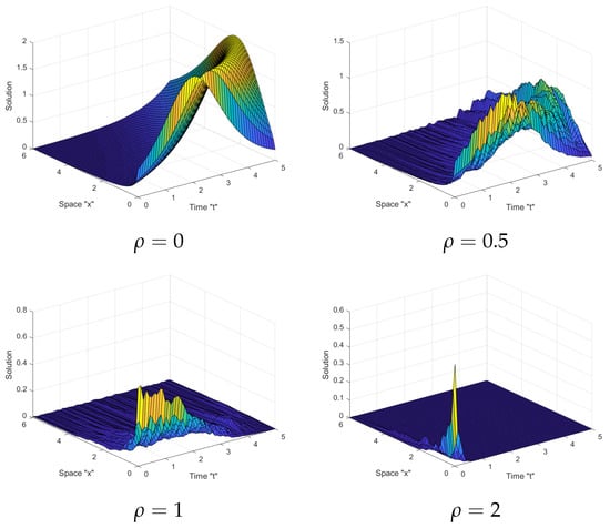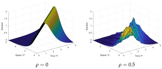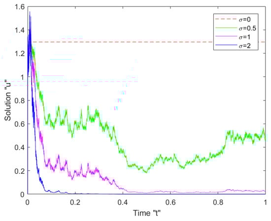 We address in this section the influence of the multiplicative Brownian motion on the solutions of the SFSBE (1). We employ MATLAB tools [] to display some graphical representations for distinct values of the noise strength and explore the influence of multiplicative Brownian motion on these solutions. We fixed the parameters In the following, we plot the solution (48) for , and :