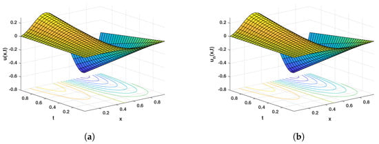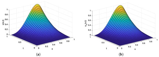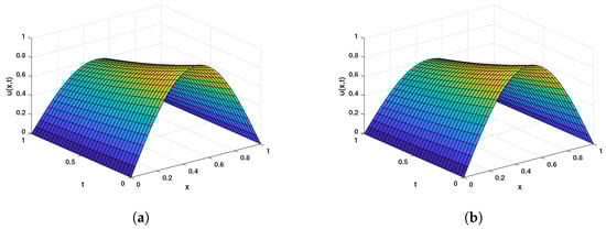 A diagrammatic comparison of the exact and numerical solutions for Example 1 with . (a) Exact solution; (b) Numerical solution.