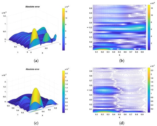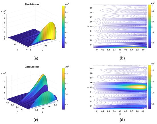 Plots indicating absolute errors and error contours for with and when in for Example 2. (a) Absolute error with ; (b) Error contour with ; (c) Absolute error with ; (d) Error contour with .