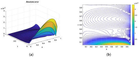 Plots indicating absolute errors and error contours for with for Example 3. (a) Absolute error; (b) Error contour.