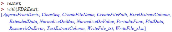 This library (subroutine) contains: procedures for the numerical analysis of the fractional Riccati equation with a variable fractional order of the Gerasimov-Caputo type derivative and nonconstant coefficients, and with the ability to visualize the results, more details in [24]. Program code for <<FDREext>> has [38] certificate of state registration of computer programs. The library for the solution is called using the instructions shown in the Figure 2: