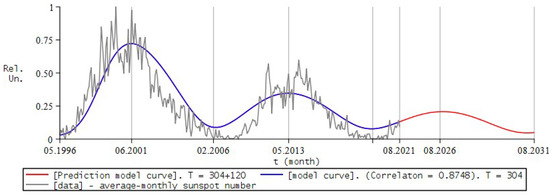 A model is considered for describing data on solar activity (SA), expressed in the average monthly number of sunspots, in order to give some forecast for the intensity of this process, and, as a consequence, the approximate boundaries of the current and future SA cycle.