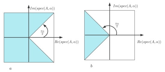 Lemma 1 is different from the results in [,]; it avoids the trouble of solving the complex matrix. Lemma 1 can be easier to solve by using the LMI toolbox. When , Lemma 1 is equivalent to the results of the integer order. For brevity, a and b denote and in this paper.