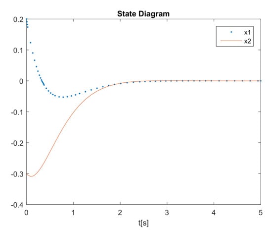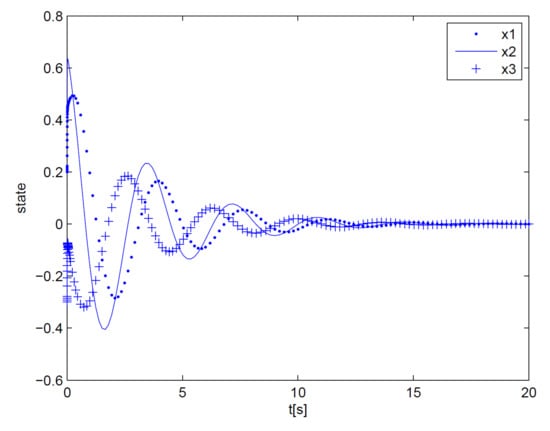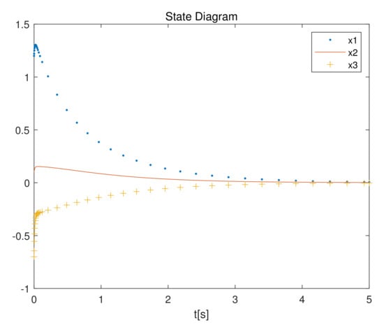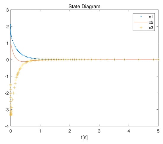 Figure 4 shows that System (31) with gain K is quadratically stable by switching strategy (39), when the system initializes at .