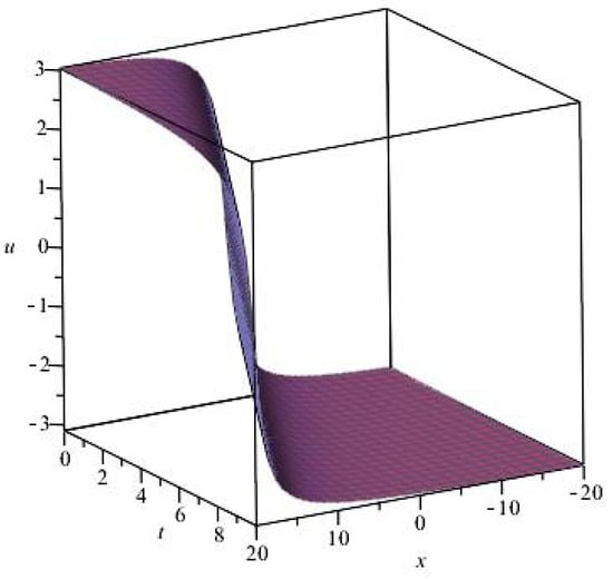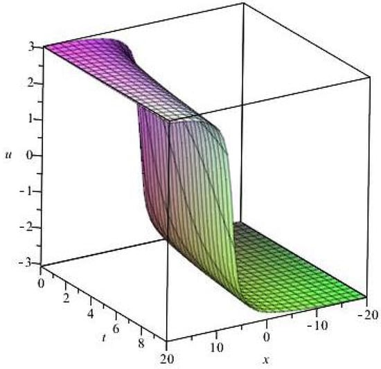 If we assume , this requirement is not equal to . Without loss in generality, we assume . It can be found that k also cannot be equal to 1 in order to guarantee the existence of the solution. This means that after fractional complex transform, it also becomes the same ordinary differential equation as Equation (24). If is equal to 1, it is the classical traveling wave transform. In this way, using the results obtained above, one can directly obtain solutions of the fractional order differential equation as described below