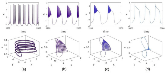 Dynamics of the Hindmarsh-;Rose neuron model states with different fractional-order derivatives. The first row shows the time series of the membrane potential, and the second row shows its corresponding attractor in the space: (a) , (b) ; (c) ; (d) .