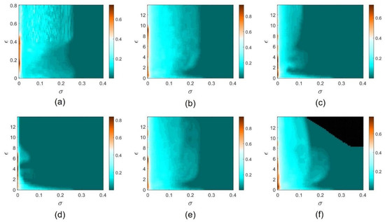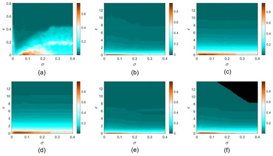 A 2D representation of the intralayer synchronization error () in the plane by considering different fractional-order derivatives for the layers: (a) ; (b) ; (c) ; (d) ; (e) ; (f) .