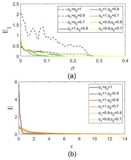 The intralayer synchronization error for according to intralayer coupling strength is shown in Figure 5a. This figure shows that for identical integer-order derivatives, the synchronization is obtained for . By changing the order of derivatives to identical fractional orders, the threshold of coupling strength for synchronization is slightly decreased. Interestingly, when the fractional orders of layers are different, this threshold is considerably varied. When decreases to , the threshold decreases to , and for , it is equal to . With more decreasing of , this threshold increases again such that for , the synchronization is obtained for . For , and , , the threshold changes to again. Therefore, the intralayer synchronization in nonidentical fractional orders is obtained in weaker couplings than the identical orders. The one-dimensional interlayer error is shown in Figure 5b and represents the difference between the results of different derivative orders.