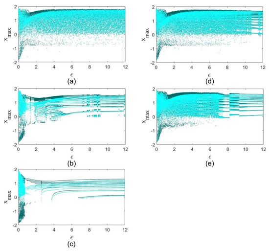 Bifurcation diagrams of the neurons of both layers according to the interlayer coupling strength: for ; (a) ; (b) ; (c) ; (d) ; (e) .