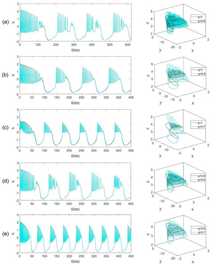 The time series and attractors of the first neurons of each layer are represented in Figure 7 in the synchronous manifold. It can be observed that although having a near synchronization state, the attractors of the neurons of each layer are different. Furthermore, as the derivative orders decrease, the frequency of the bursts increases. The highest burst frequency value is in (Figure 7e) case, and the lowest frequency is obtained for case (Figure 7a). Comparing Figure 2 and Figure 7 we conclude that this result contrasts the dynamics of the single neuron wherein the frequency of burst decreases by decreasing the fractional order.