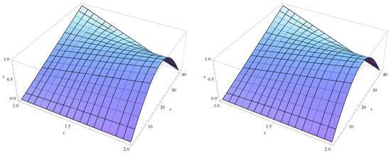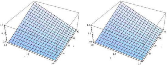 Here . The and are used to solve this problem. The greatest absolute and error norms for and with are reported in Table 2. To prevent contaminating spatial and temporal-discretization errors, is set to a relatively modest value in this problem. The Kth time level is modified to assess the correctness of the presented approach, which demonstrates its efficiency. The suggested technique accurately approximates the analytical solution, as shown in Table 2. As illustrated in Figure 2, the numerical and precise solutions are displayed using , , and = 0.000001.