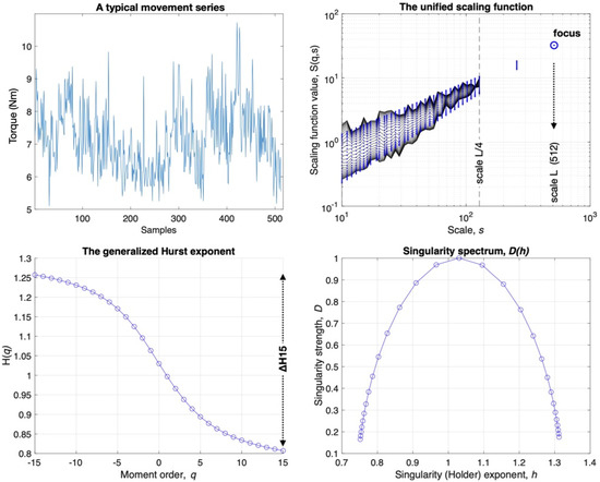 Multifractal characteristics in torque output time series were obtained by using a focus-based multifractal detrended fluctuation analysis, FMF-DFA, developed in [