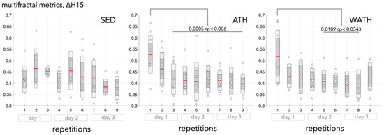 24]) to generate 50 surrogates of the initial series. True multifractality away from background noise in a series was admitted when ΔH15 of the empirical series was significantly higher than the averaged ∆H15 obtained from surrogate series.
