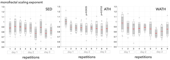 Figure 2). In addition, the surrogate data testing indicated an evenly distributed presence of nonlinear dynamics, reflected in wider multifractal spectrum in original series, across all repeated movement series (see