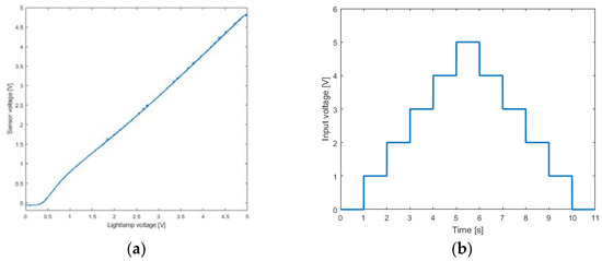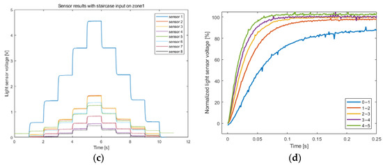 Before the control design of the system, it is beneficial to know the static characteristics of the system to check linearity zones. The static characteristics of the control zone 1 can be obtained by several staircase experiments. In the experiment, the lamp input voltage of the zone 1 was varied linearly from 0 to 10 V while recording the output value according to the sensor. The measurement result is shown in Figure 2. It can be seen from the experimental results that, when the input voltage between 0 and 5 V, the output voltage is almost zero. There are two main reasons for this phenomenon. One is that the sensor is not sensitive to weak light response, and the other is that the lamp does not emit brightness when the voltage is small. When the input voltage is 5–10 V, the output increases almost linearly. A linear system is more conducive to the realization of the control method in the research. Consequently, we chose to operate in the interval from 5 to 10 V. In this region, the output rises almost linearly with the input voltage. Next, a staircase experiment was carried out in zone 1 to verify the dynamics of the system. The input was altered from 0 to 10 V, increasing by 2 V each step. Between the two jumps, the input value remained unchanged such that the system could reach its steady-state value. In order to compare the dynamics of each step, the data of each step were standardized, as shown in Figure 2.