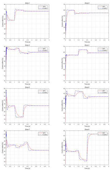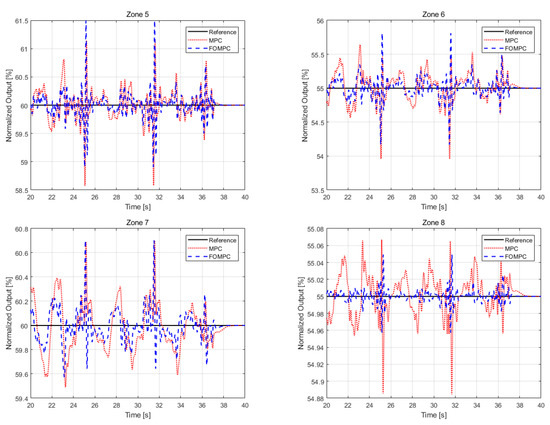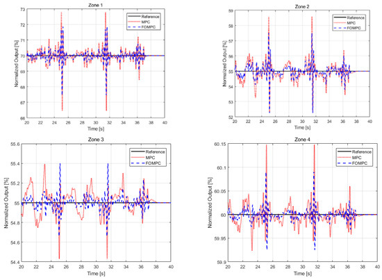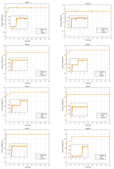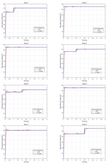 As expected from the literature [30], within a certain range, a larger fractional order leads to a faster response time and smaller overshoot. Through the test, the fractional orders of the eight zones were set to 2.2, 2.2, 2.2, 1.62, 1.62, 1.82, 1.82, and 1.82. As tuning parameters for MPC, the control horizon was one sample and the prediction horizon was 18 samples. The simulation results of reference tracking performance are shown in Figure 4 and Figure 5.