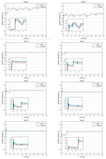 In order to evaluate the control performance of FOMPC proposed in this paper, we compared the classical MPC control method with the proposed FOMPC control method. Taking the eight zone models of the multiple lighting control system as the object, the simulation experiment was carried out. Through the reference tracking experiment, the step signal was introduced into the system at different times. The simulation time was 40 s, and the sampling time was 0.01 s. The set values of the eight zones are shown in Table 1. In addition, in order to test the disturbance rejection performance of the controller, a random disturbance signal less than 0.5 was added through the Simulink repeating sequence module when the simulation time was 20 s to 40 s.