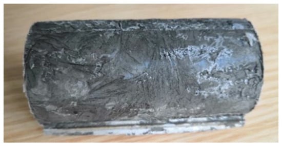 The soft clay was taken from 15~20 m below ground in Hangzhou. The soil samples were mainly composed of illite and illite-montmorillonite minerals. The physical and mechanical properties of the soil sample were characterized by low strength, low permeability, high compressibility and high sensitivity. For the saturated soft clay, its natural weight is 17.7 kN/m3, density ρ = 1.82 g/cm2, relative density Gs = 2.75, water content ω = 45%, plastic limit ωP = 33.4%, liquid limit ωL = 51.6%, plasticity index Ip = 18.2 and reference thermal conductivity 0.8−1 W·m−1·K−1. The freezing soil sample is shown in Figure 1.