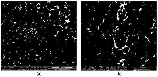 Figure 2 shows representative SEM images of soil microstructure before and after freezing and thawing at −20 °C. From Figure 2a, it can be observed that the micro-structural characteristics of the remodeled soil before freezing mostly are in the form of edge–edge and edge-surface contact between the structures. The clumps are inlaid with each other in outline. There are obvious fissures between the clumps, and the fissures are filled with agglomerated fragments of sheet-like soil particles. After freezing, it can be clearly observed that the soil structure became looser; a honeycomb flocculation structure and feather-like flake structure appears around the soil particle aggregates, as shown in Figure 3b. It also can be seen that the agglomeration structure between soil particles was destroyed, which increased the complexity level of the pore morphology.