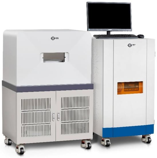 The MesoMR23-060H-I low-field NMR (Suzhou Niumag Analytical Instrument Corporation, Suzhou, China) equipment used is depicted in Figure 4. With the help of this equipment, the pore structure and fractal characteristics could be studied. The central principle of NMR is that a nucleus always spins around its own axis at a constant frequency, generating a magnetic field when the number of protons is odd and the number of neutrons is even. Because the H element in water follows this law, it can be used to calculate water content. Furthermore, the bound water and flow water can be distinguished by NMR spectra [38].