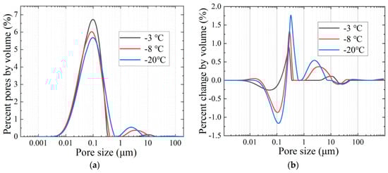 Figure 7a shows the pore distribution of frozen–thawed soil at different freezing temperatures. With the decrease of the freezing temperature, the peak value of the proportion of small pores decreases, while the proportion of medium pores increases. In Figure 7b, as the temperature dropped, the percentage change of pore size from 0.01 μm to 0.2 μm decreased and formed a main trough. At the same time, the percentage change of pore size between 0.2 μm and 1 μm increased to form a main peak. It is quite clear that the increase of the main peak was a result of the reduction of pores from 0.01 μm to 0.2 μm in diameter.