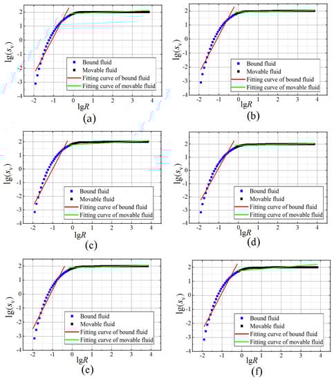 The lgSv-lgR curves under various freezing durations: (a–f) represent 1 h, 2 h, 4 h, 6 h, 12 h and 18 h, respectively.