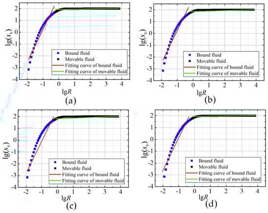 The lgSv-lgR curves under various freezing pressures: (a–d) represent 50 kPa, 100 kPa, 200 kPa and 400 kPa, respectively.