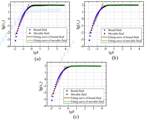 If the pores have a self-similar pore structure and fractal characteristics, then Equations (6) and (7) present linear relationships between lgSv and lgR. The calculated fractal dimension values for the NMR test are listed in Table 2.