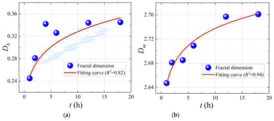 where D is the fractal dimension values, t is the freezing duration, a is the parameter related to soil structure properties, and b is related to the degree of freezing failure. The value of a and b is shown in Table 3. The fractal dimension increases with the freezing duration and tends to a fixed value a. A large proportion of the freezing process was concentrated in the first 6 h. Considering the energy required to freeze water, the movable fluid will be frozen quickly, and the bound fluid could be partly frozen, with the freezing time growing during the freezing process. Water freezing can break the structure of the soil’s skeleton, so the fractal dimension grows as the freezing progresses.