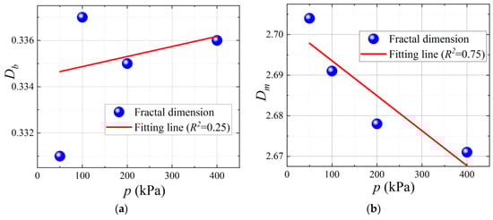 Figure 12 shows that the value of Db has no apparent linear relationship with the freezing pressure, while Dm is negatively correlated with the value of freezing pressure. The reason is that, for frozen-thawed soil, fractal dimension change is the result of frost heave action during freezing progress. When water freezes under a certain confining pressure, the freezing proportion of the water in the mesopores decreases. When the ice melts under a certain confining pressure, the pores’ structure is compressed greatly under the dual action of confining pressure and dead weight. In conclusion, the greater the pressure applied to the soil samples during freezing and thawing, the less the effect from frost heaving, and the lower the fractal dimension value of the thawing soil’s structure.
