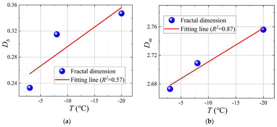Figure 13a,b shows the relationship between fractal dimension and freezing temperature, and the degree of damage to the pore structure caused by freezing temperature can be clearly obtained. There is an obvious correlation between the fractal dimensions of the movable fluid (Figure 13b). Freezing progress is an energy exchange process; a lower freezing temperature has greater energy to break the chemical bonds and physical bonds between the pore water hydron. It can be seen that the lower the freezing temperature, the more loose the skeleton structure, and the larger the fractal dimension. The water in the macropores is more easily frozen than the water in the micropores; therefore, the relativity between the fractal dimension of movable fluid to the freezing temperature is larger than that of the fractal dimension of the bound fluid.