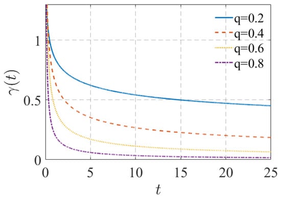The shape of damping kernel function with the friction coefficient is shown in Figure 1, it finds that has a power-law attenuation trend with the speed of , and it would degenerate into Delta function when approach . Inserting (6) into (5) and using the definition of Caputo derivative, Equation (5) can be further transformed to the following FDE