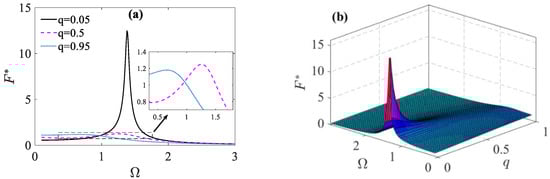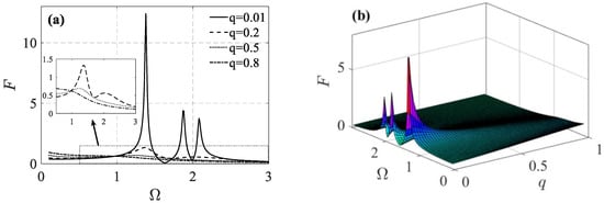 (a) Output amplitude of system (36) versus excitation frequency under different fractional order. (b) Analytical result of versus and according to Equation (38).