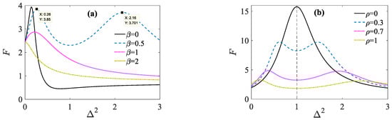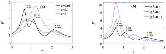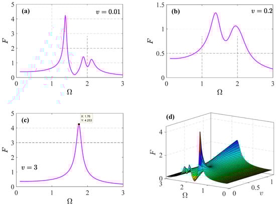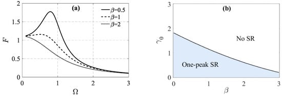with the equivalent damping coefficient . For the case of (), by solving in Equation (41), one has , the single-peak-resonance always exists in the system, which is consistent with the single peak point position in Figure 3c. For , only single-resonance may occur at , and the existence condition is