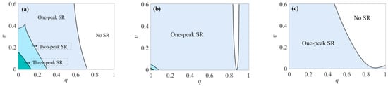 Figure 6 shows the influence of noise intensity on bona fide SR of the system with respect to the parametric region , under the polynomial trichotomous noise coefficient setting , . Considering the system parameters , , , , , it can be seen from Equation (38) that the system always exhibits monostable bona fide SR phenomenon when the trichotomous noise is absent. By comparing Figure 6a–c, it is apparent that appropriate noise intensity is conducive to the occurrence of SMR. When the noise amplitude is small (Figure 6b), only single-resonance appears in the highest range of parameter values (light blue area in the figure), with non-resonance appearing around . When are close to zero, a small range of two-peak resonance (cyan) and three-peak resonance (green) regions appear, indicating that thedditionn of trichotomous colored noise has enriched the stochastic resonance phenomenon of the system. When increases to one, the proportion of the double-resonance region and triple-resonance region increase significantly, which reflects the fact that the SMR phenomenon of the system can be enhanced by the appropriate noise amplitude. However, it is not the case that the stronger the noise is, the stronger the resonance of the system will be: excessive noise intensity (Figure 6c) results in the disappearance of SMR in the system. Moreover, excessive noise intensity will even lead to the non-stochastic resonance (white) with a wider range of parameters than the noise-free case.