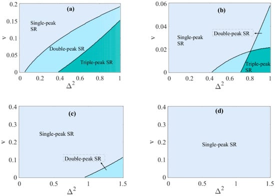 Different GSR patterns relying on combined parameters under (a) , (b) , (c) , (d) . Single-peak SR happens in the grey area, double-peak SR happens in the cyan area, and triple-peak SR happens in the green area, respectively.