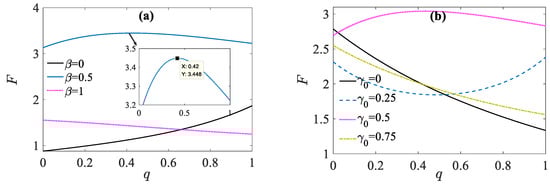 Considering the influence of fractional order on the system output amplitude, it is difficult to give the explicit expression of the critical value corresponding to the zero of since the output amplitude is a complex function of . Even so, dependence of the amplitude of the system output signal on the flatness parameter can be obtained by calculating the expression numerically, given in Figure 12 with parameters , , , , , , , . The system response manifests as a monotone increasing function of under the linear trichotomous noise disturbance. When the colored noise is in nonlinear form (), the output amplitude of the system peaks at , that is, the fractional damping order does make the system produce the phenomenon of GSR. When different damping intensity values are considered (Figure 12b), we determine that has a great influence on the GSR phenomenon induced by damping order. Moreover, the output amplitude decreases with the increase in damping order for and , while stochastic resonance occurs at for , and a minimal resonance point emerges when .