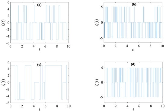 1. Without loss of generality, assume the noise is located initially at at time , i.e., , . At time point, to determine whether the process moves to the other two sites or merely remains at the same site, we consider the conditional probability matrix as given by (3). Then, it generates a uniformly distributed random number that is falling in , which is then compared against the three values in the line of the conditional probability matrix. If , then we accept the value of the noise , i.e., , and if we accept the value or , otherwise, it will be located at , i.e., ;