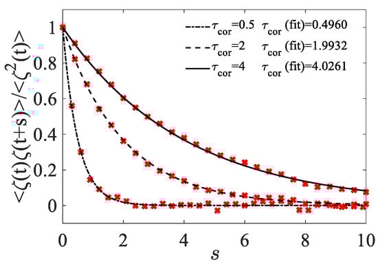 It should be noted that the time interval between the two steps () is always fixed and be equal to , which should be much smaller than the correlation time of the noise (). Let , , and the total time , Figure 13 shows four realizations of the trichotomous noise under different steady-state probability parameters and different correlation times. Closer observation would reveal that a larger is often accompanied by a longer residence time of a particular state on average, with a larger value that would lead to a shorter residence time at the origin during the noise switching between and . Comparing the left and right figures, one finds that smaller relaxation time corresponds to a faster average switching rate between the three states. In order to examine the accuracy of the above numerical algorithm, we first calculate the arithmetic average value of sample results; the first moment of generating time series is determined to satisfy the zero-mean characteristic of trichotomous colored noise (). In addition, to check whether the results satisfy the theoretical autocorrelation function, we give the theoretical and numerical results of the normalized auto-correlation function under different characteristic relaxation time, as shown in Figure 14, wherein red markers represent the simulation results for samples. is the exponential order of the fitting curves of discrete results. It can be seen that the relaxation time is very consistent with the theoretical setting, which in turn proves the feasibility (of this algorithm).