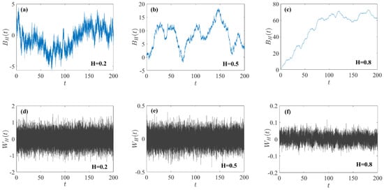 , , denotes the time step, the total time, , , , , the initial condition in is set as . , is the trichotomous noise state at . is the state value of FBM at , which is generated by the Wood–Chan algorithm [44]. Based on the discrete Fourier method, this method provides a high computational speed, even in the case of large time step. Figure 15 shows the simulated time series of the process of FBM and their corresponding FGN under different Hurst indices. It can be seen that compared with the classical White Gaussian noise (), the larger H is, the smoother the sample path is. The situation of is opposite to that of , moreover, the range of FGN decreases with the increase in Hurst index.